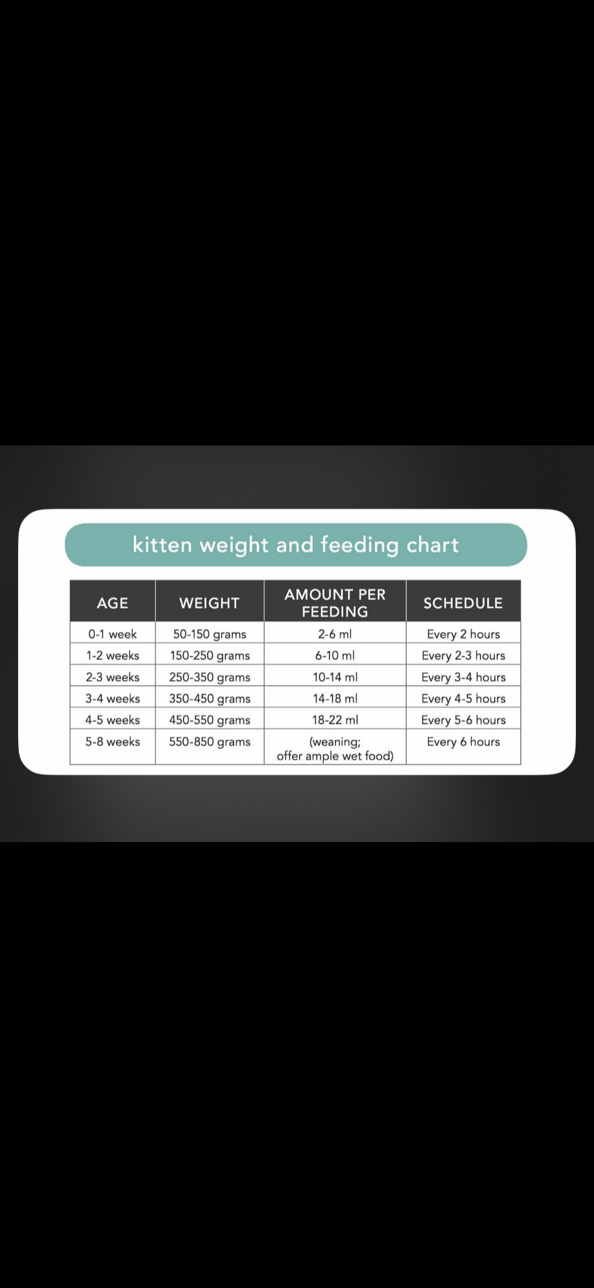 These are handy guidelines. Kitten formula is available at most vets and at many stores. When a little life is at risk the kitten replacer formula you can find is suitable. Please feel free to call us, we often have supplies including bottles and Formula, and some helpful advice.